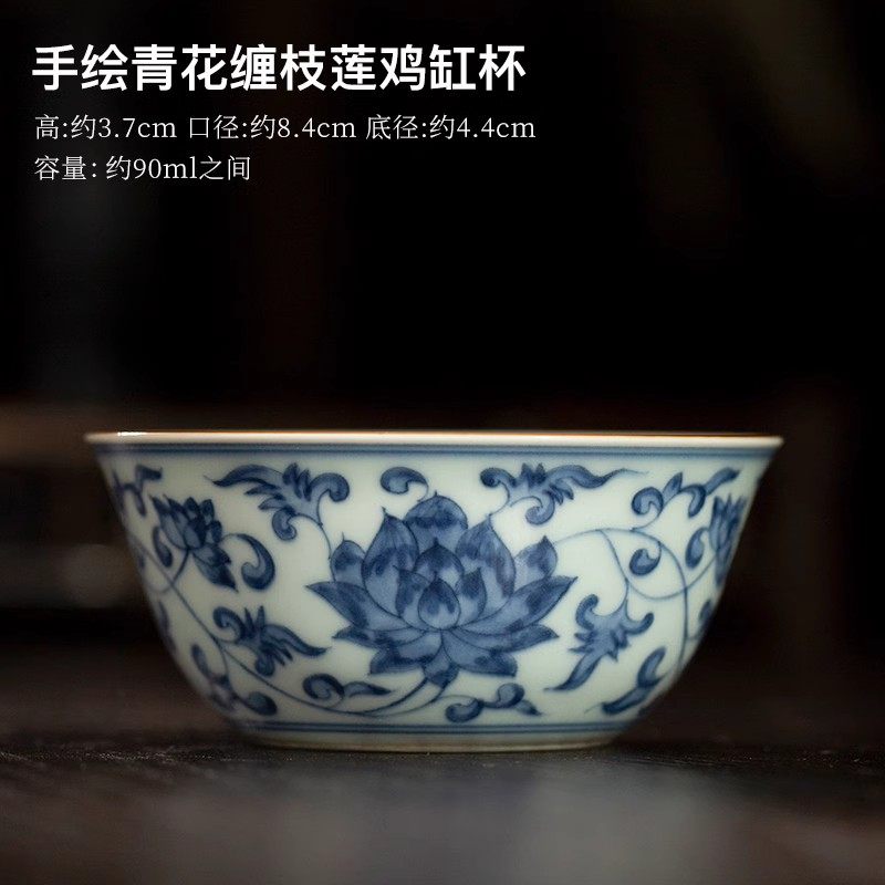 三勤堂青花缠枝莲仿古单杯手绘茶具景德镇鸡缸杯陶瓷功夫茶主人杯
