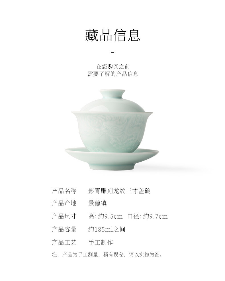 三勤堂影青瓷浮雕三才盖碗家用中式茶具龙纹功夫茶具单个泡茶碗