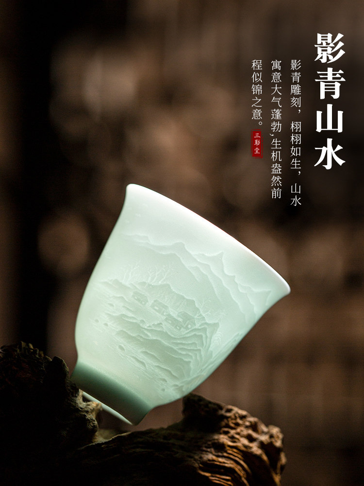 三勤堂影青雕刻山水主人杯陶瓷茶杯个人专用单杯闻香杯功夫茶具