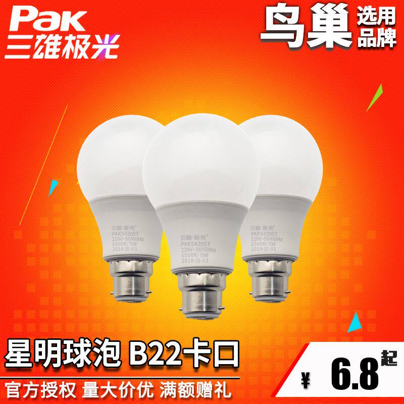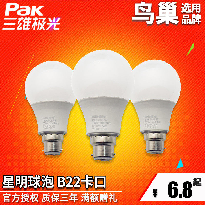 三雄极光LED节能灯泡家用白黄光5w7w超亮B22卡口E27螺口吊灯球泡