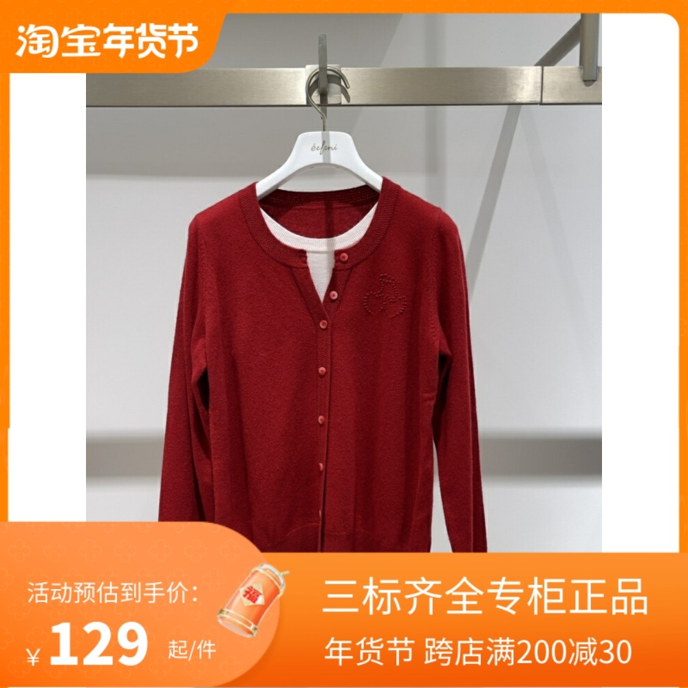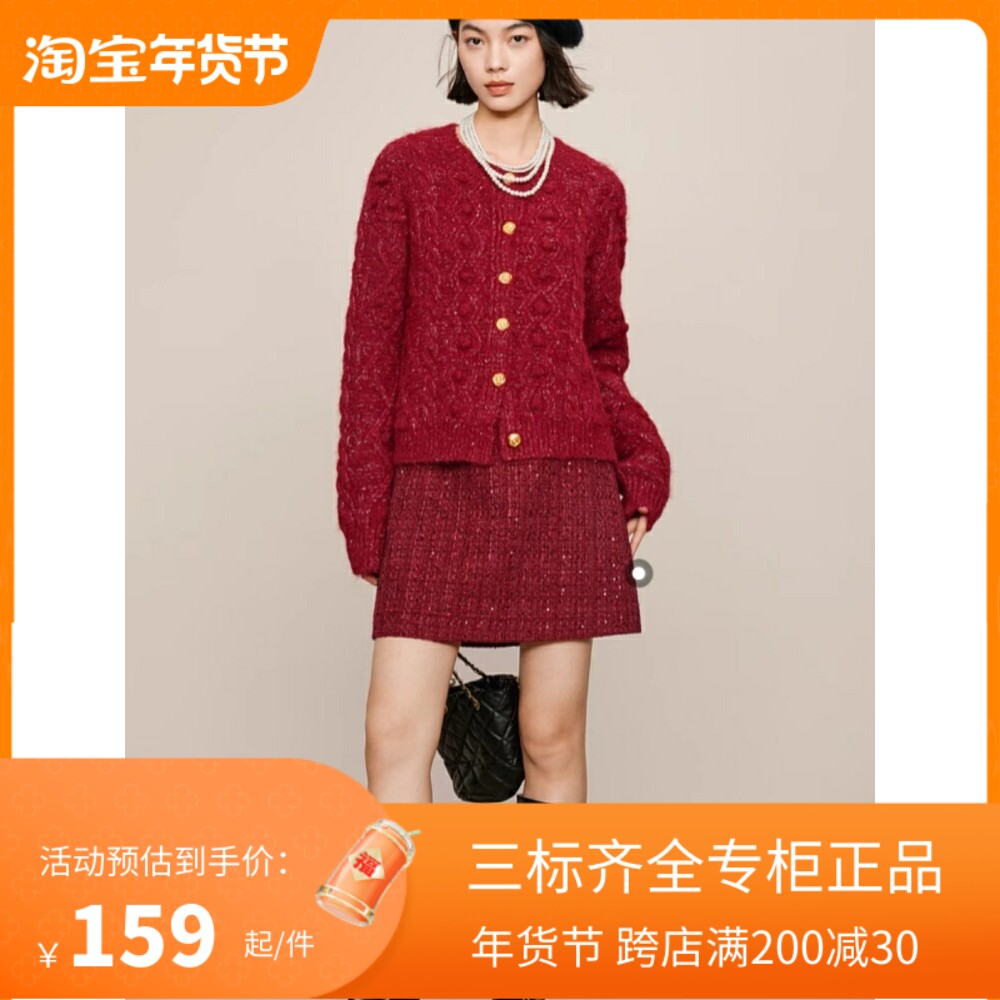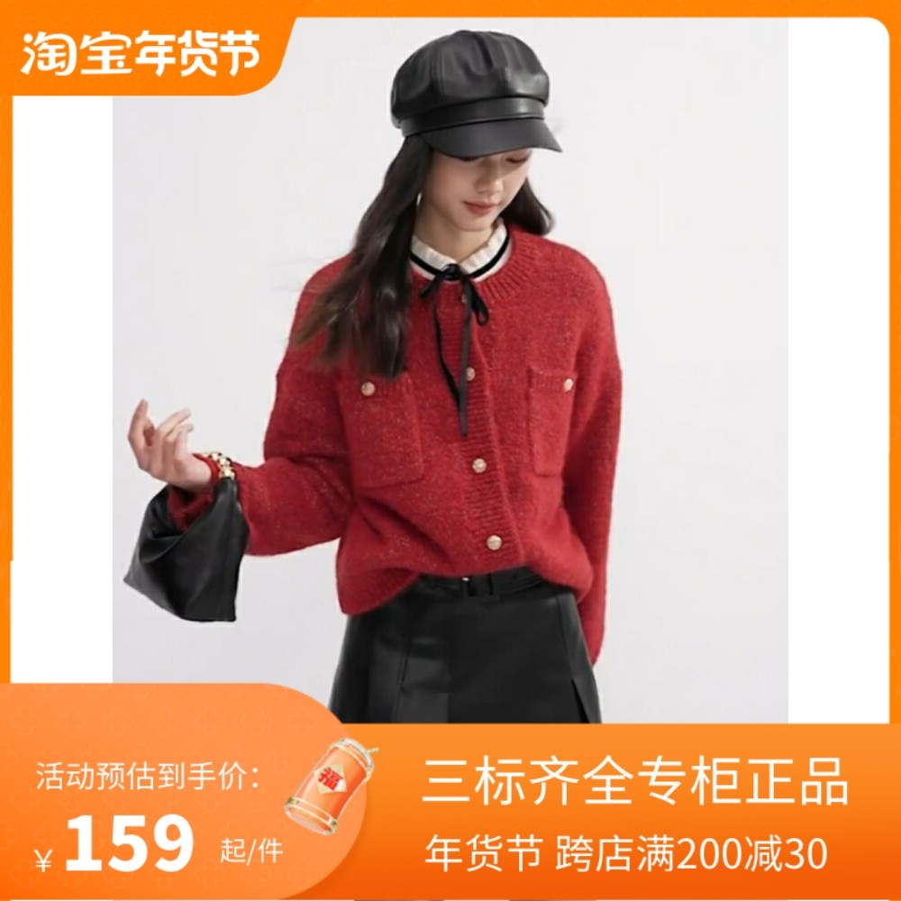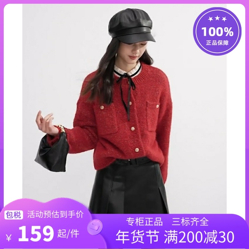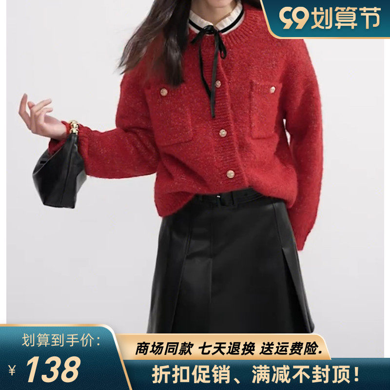 商场同款简尚伊芙丽千金风气质圣诞红色针织开衫女2023冬装毛衣女