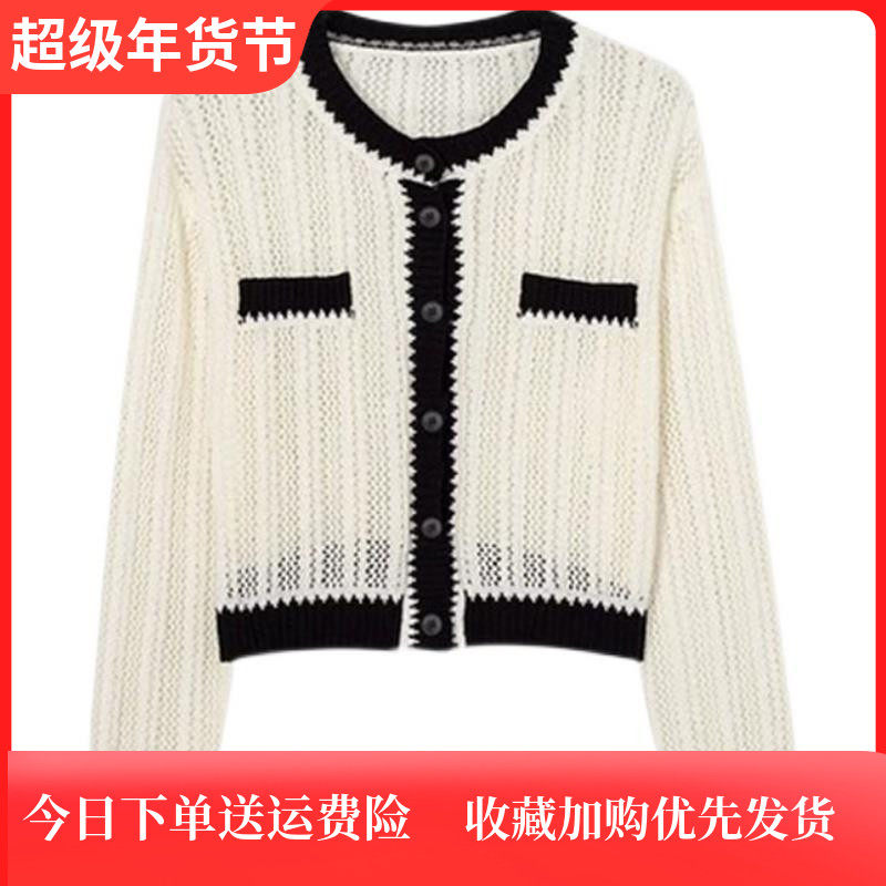 伊芙丽圆领小香风黑白撞色镂空针织开衫女2023秋装新款设计感上衣