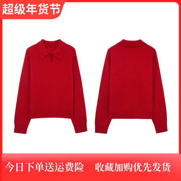 伊芙丽翻领新年圣诞红色毛衣针织衫女2023冬装休闲百搭高级感毛衫