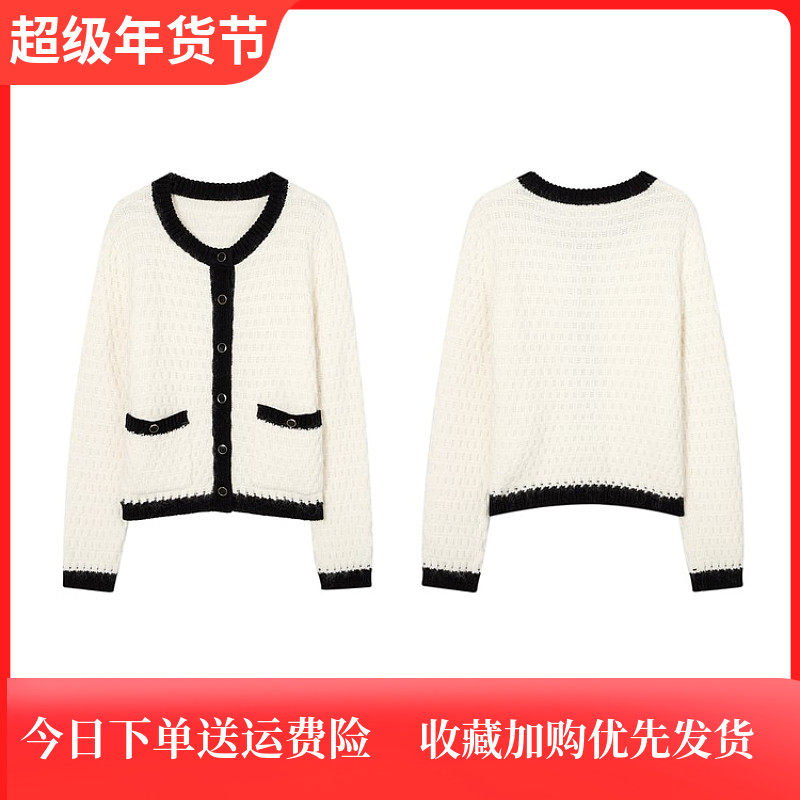伊芙丽经典黑白撞色小香风圆领针织开衫女2023秋装新款千金风穿搭