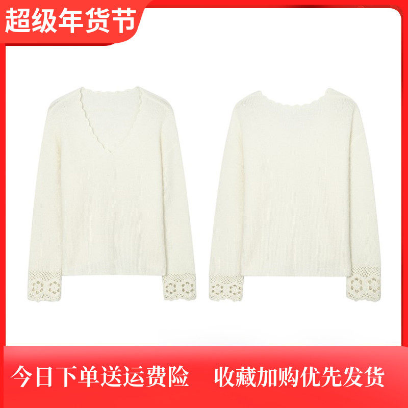 伊芙丽v领手钩花长袖针织气质内搭上衣2024春装新款设计感打底衫