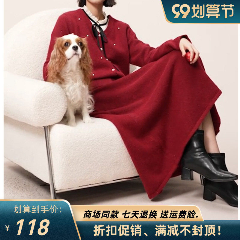 商场同款简尚伊芙丽千金风V领钉珠红色新年圣诞风针织衫半身裙女