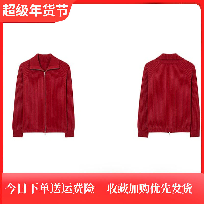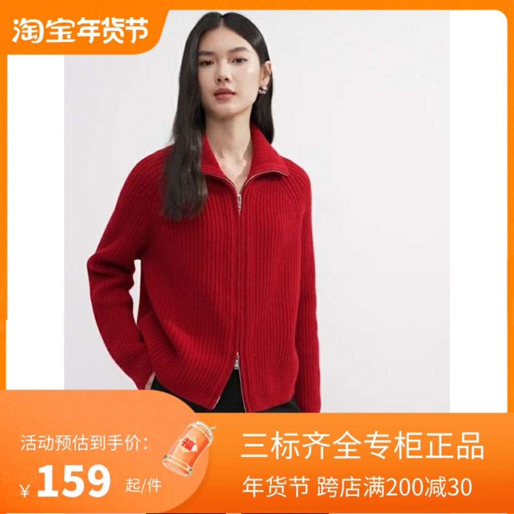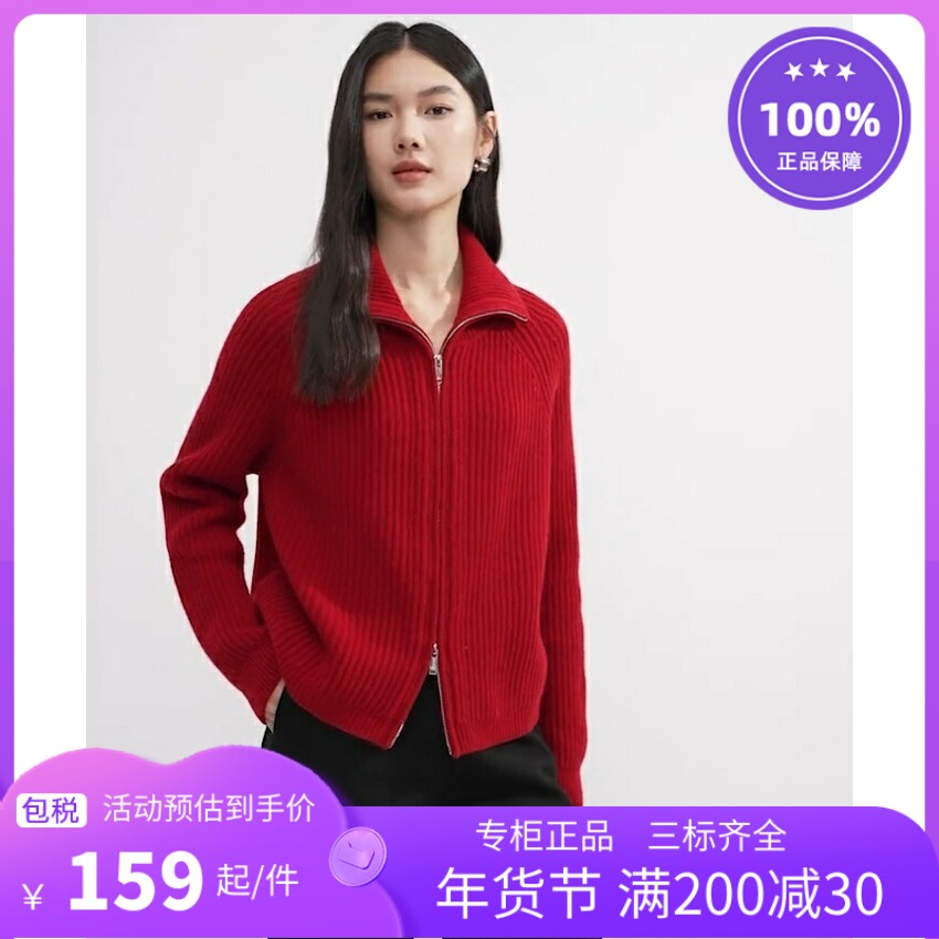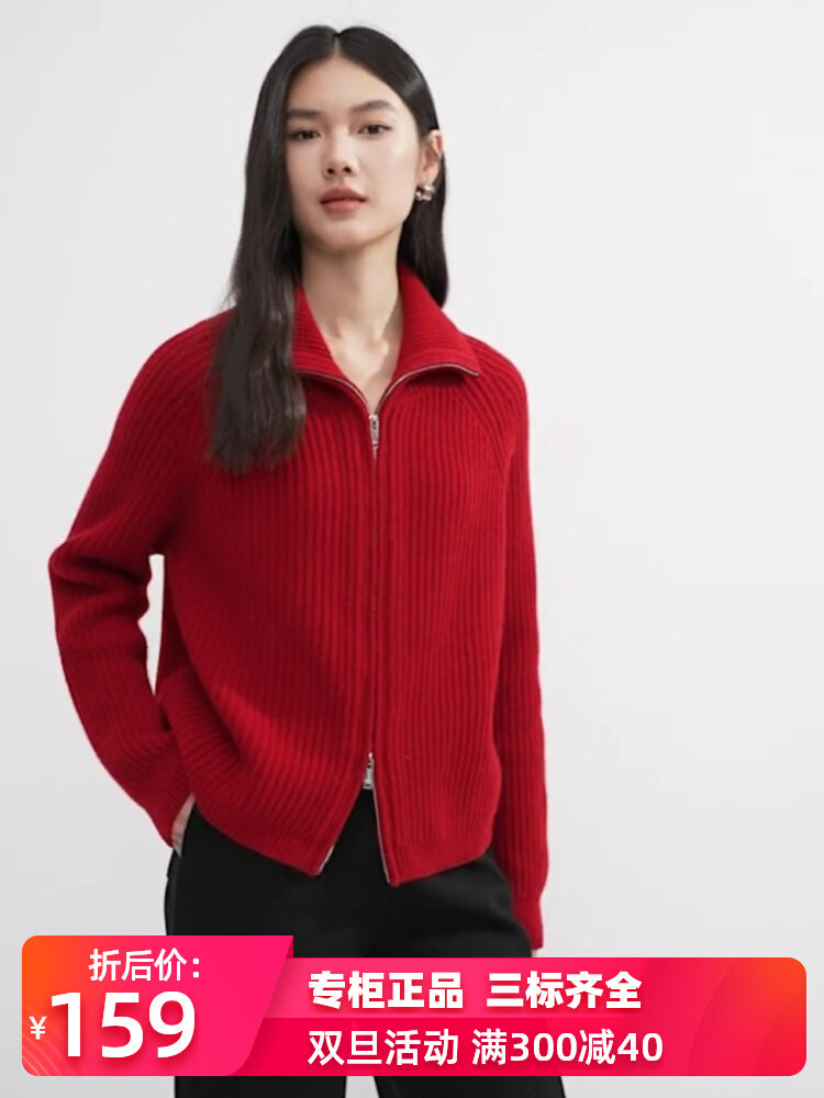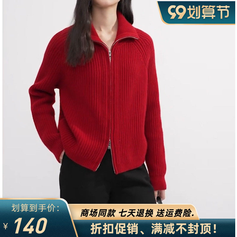 商场同款简尚伊芙丽新年圣诞红色羊毛拉链针织开衫2023冬装上衣女