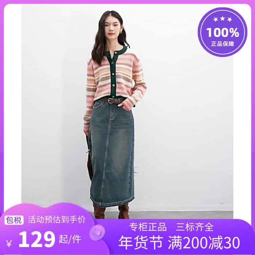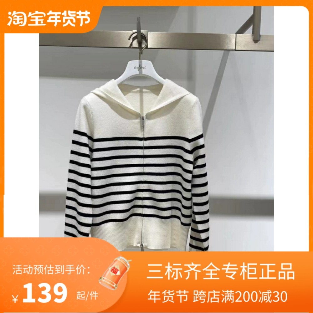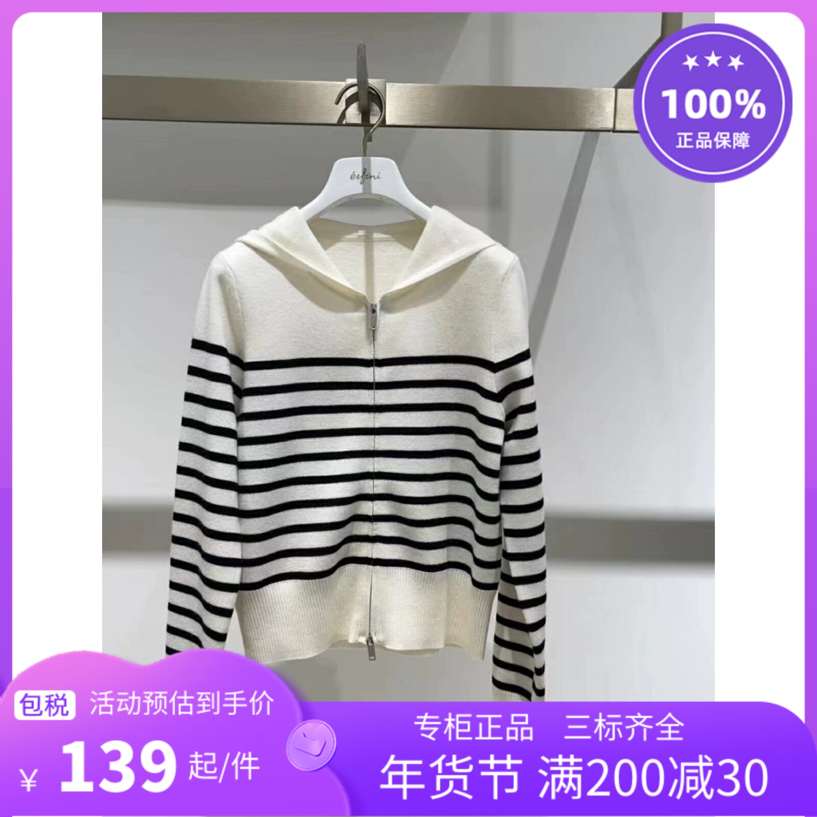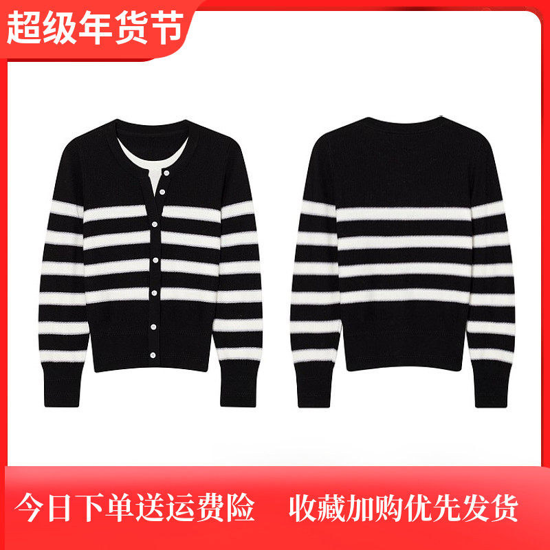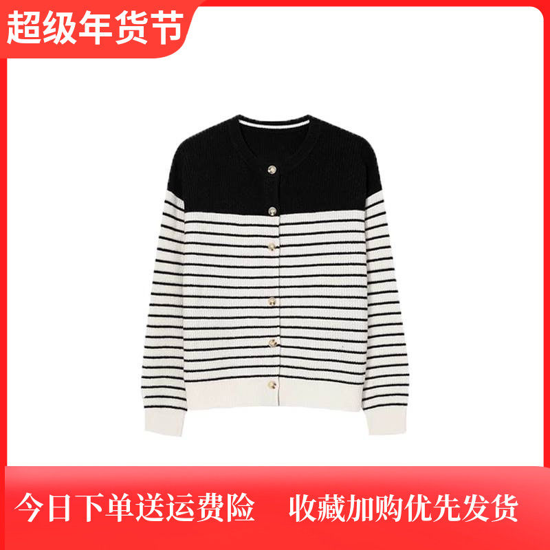 伊芙丽圆领条纹针织开衫2023冬装新款百搭毛衫毛衣女1EA933831