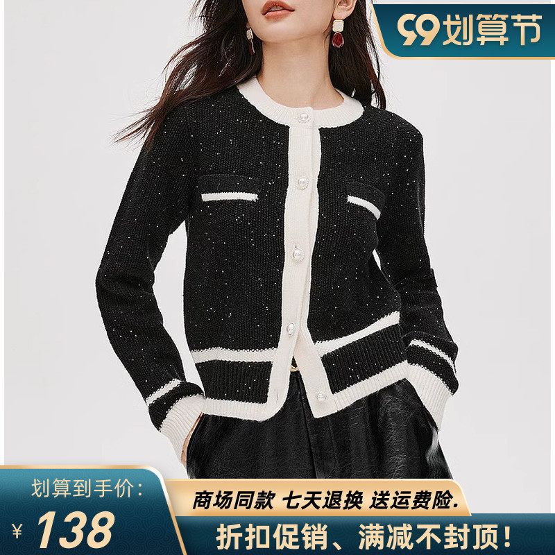 商场同款简尚伊芙丽小香风黑白撞色毛衣OL圆领亮珠片显瘦针织开衫