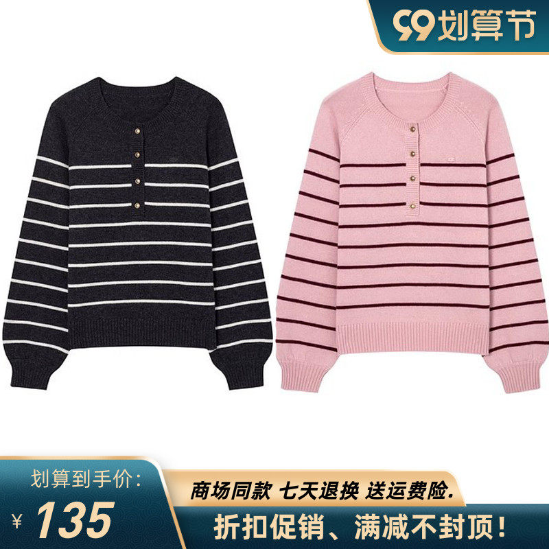 【可机洗】简尚伊芙丽撞色金属扣条纹毛衣女OL休闲百搭羊毛针织衫