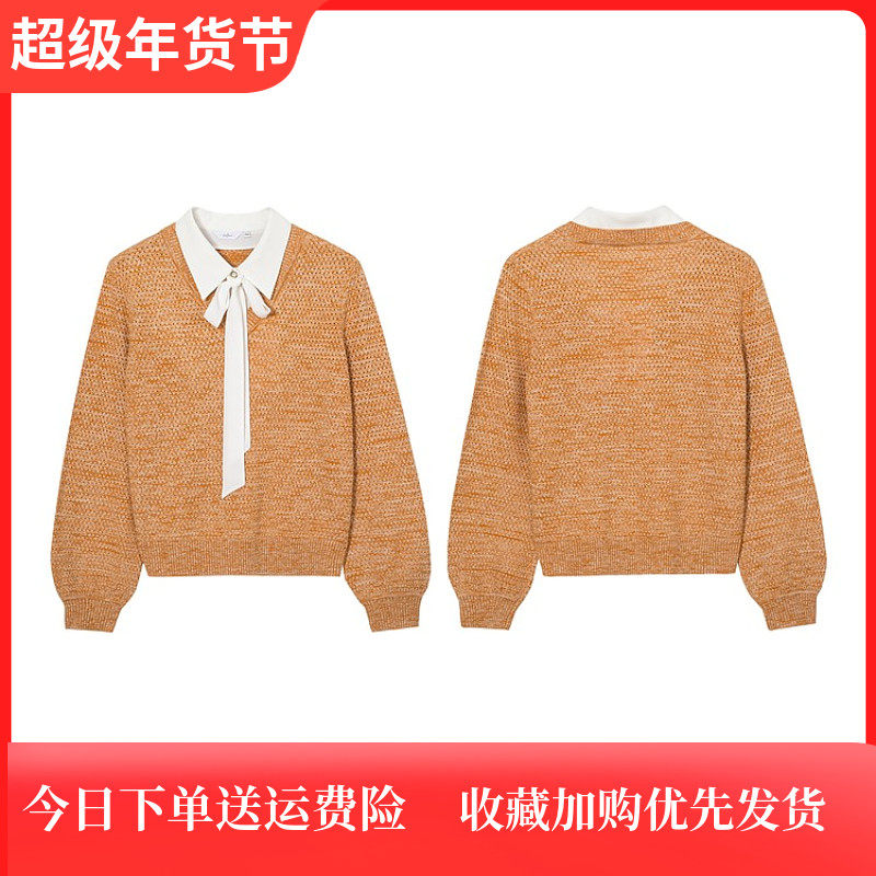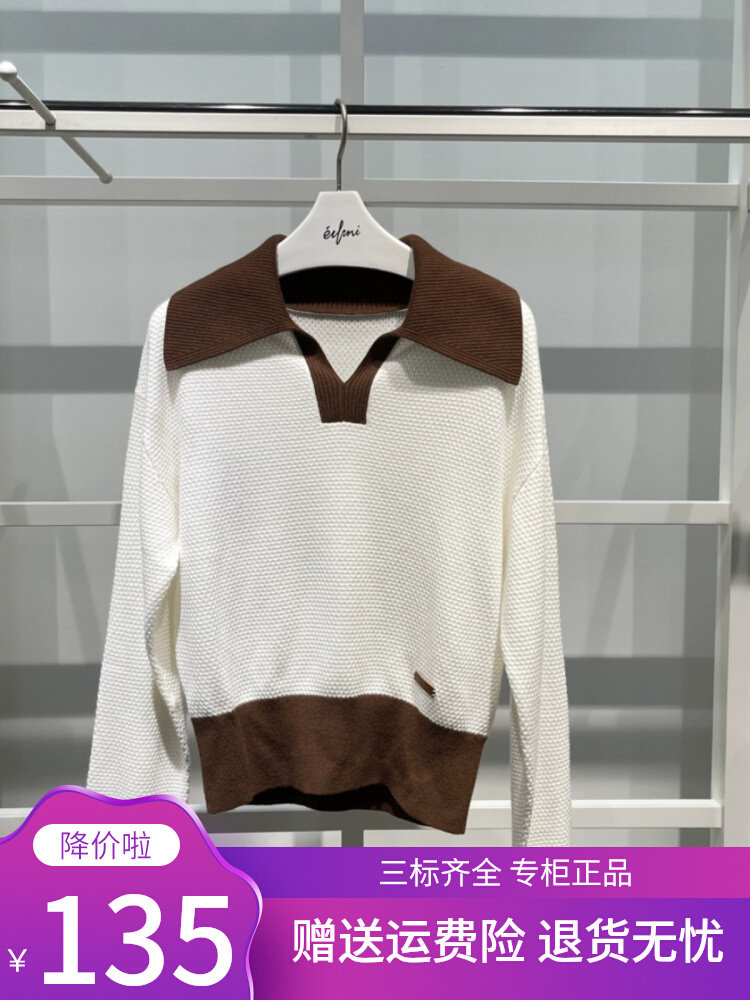 伊芙丽2023秋冬款百搭宽松翻领长袖撞色针织衫毛衣1E9131471G