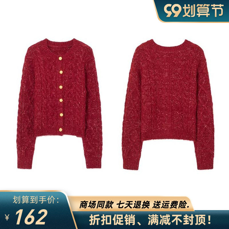 商场同款简尚伊芙丽圣诞战衣红色钩花针织开衫女羊毛上衣跨年战服