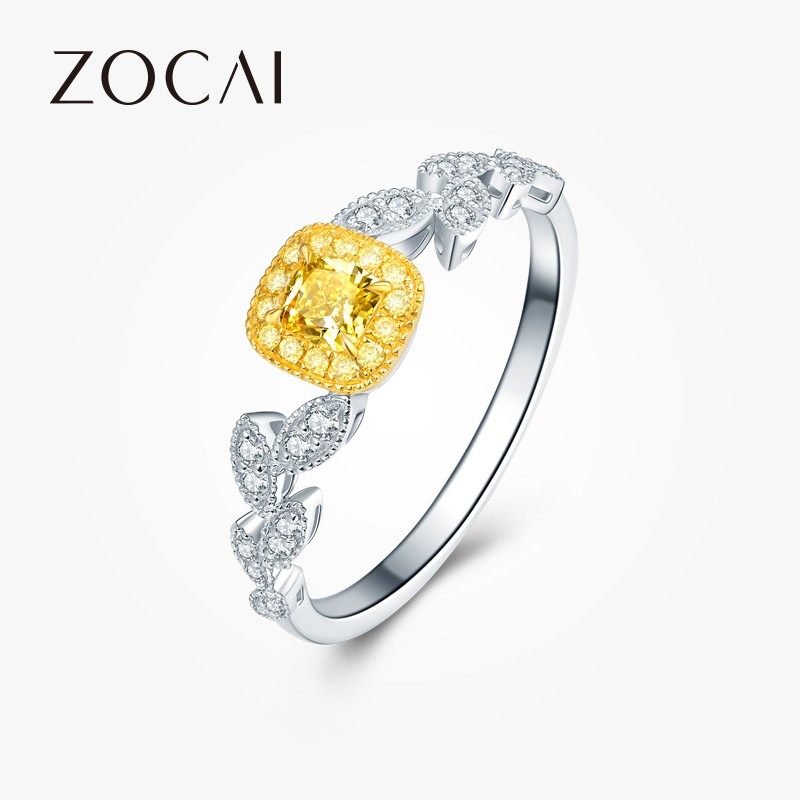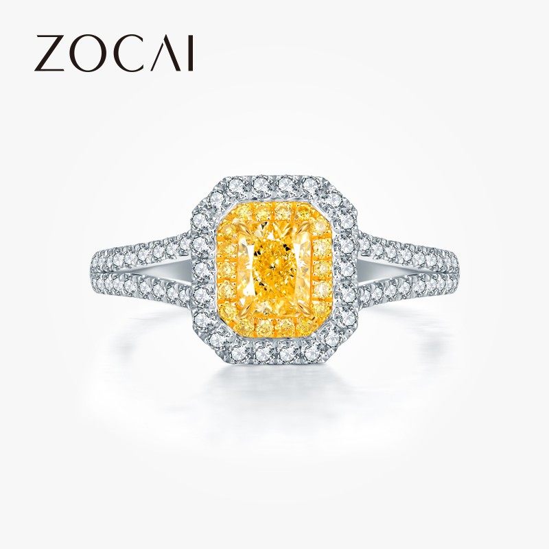 佐卡伊 18K金钻石枕形黄钻钻戒奢华群镶结婚求婚戒指女士珠宝新款