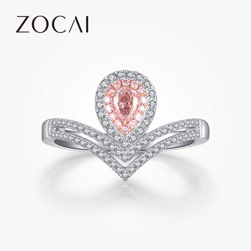 佐卡伊 18k金水滴形浓彩粉钻结婚戒指正品 送女友求婚表白钻戒