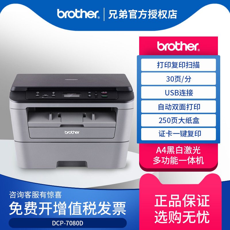兄弟DCP-7080D自动双面激光打印机复印扫描一体机办公商用家用小型高速黑白复印件A4多功能三合一7080 7500D