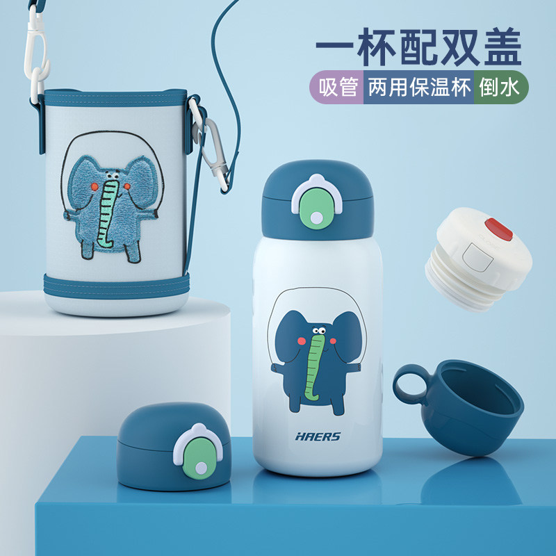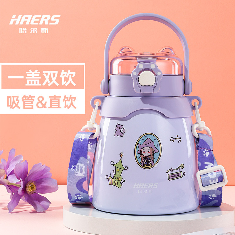 哈尔斯高颜值背带316不锈钢猫抓吸管大肚真空保温杯子卡通儿童壶
