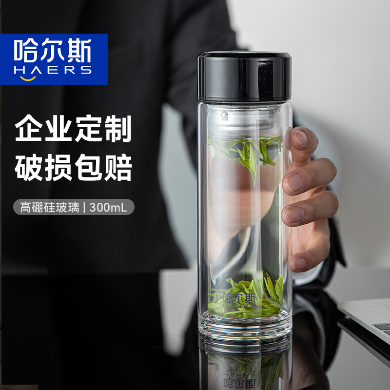 哈尔斯双层耐热玻璃杯女简约便携刻字定制男士泡茶带滤网家用水杯