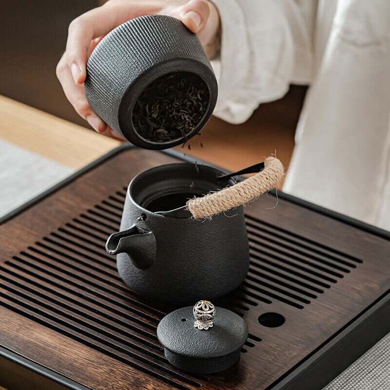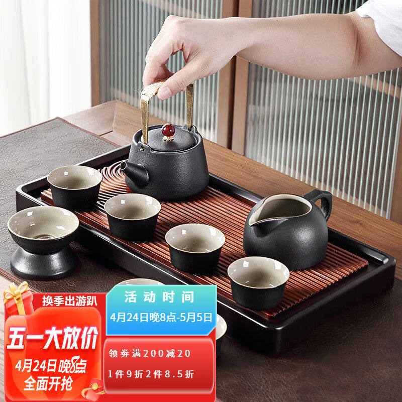 唐丰功夫茶具套装家用办公室轻奢高档复古黑陶泡茶提梁壶排水茶盘