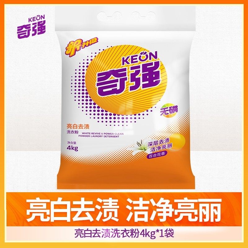 奇强亮白洗衣粉1袋4kg全面洁净强力去油渍污渍家庭装儿童衣物适用