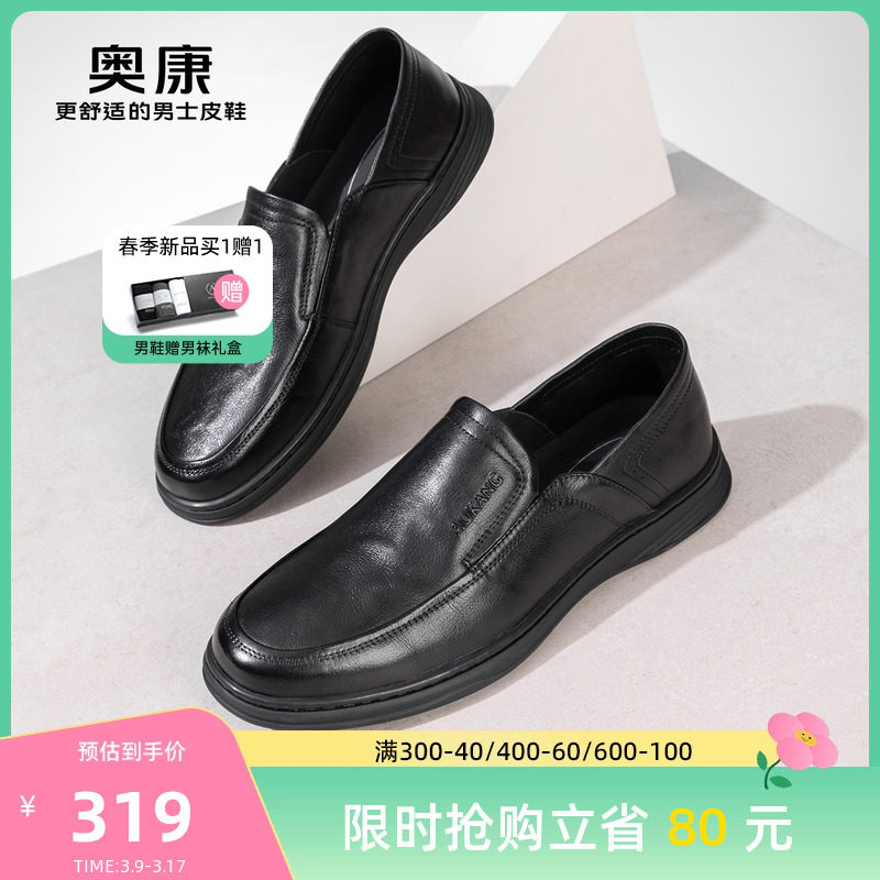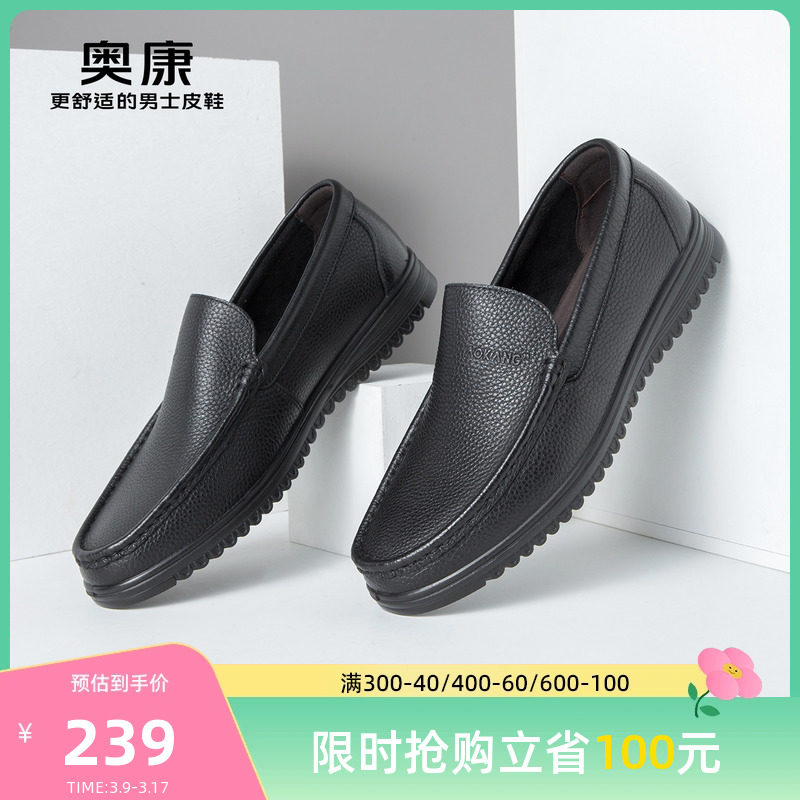 奥康皮鞋男春季新款真皮透气商务休闲皮鞋中老年软底一脚蹬爸爸鞋