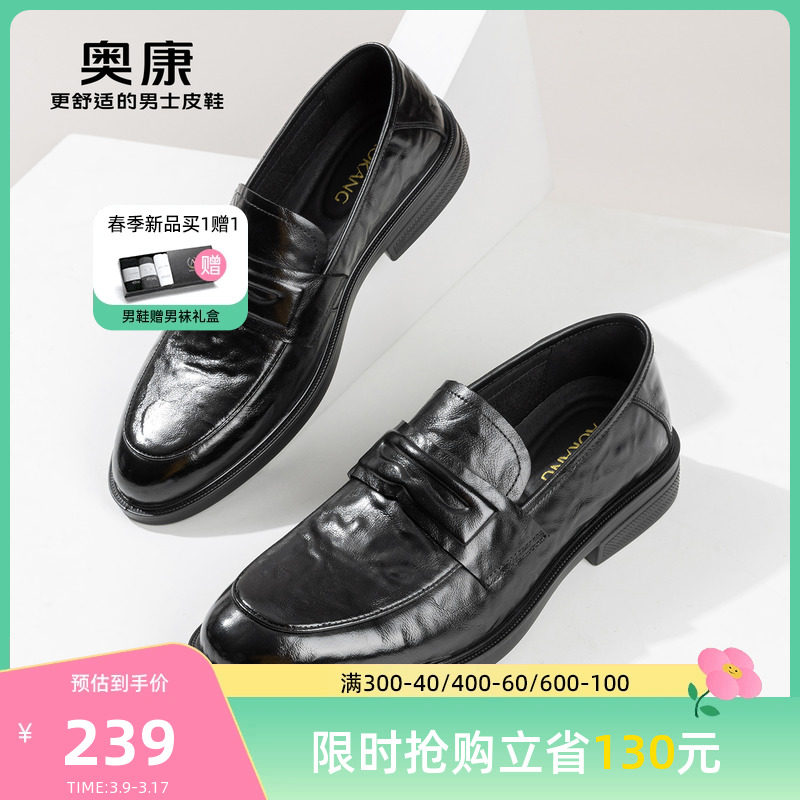 奥康男鞋2024春季新款商务休闲鞋真皮乐福鞋抓皱纹理舒适透气单鞋