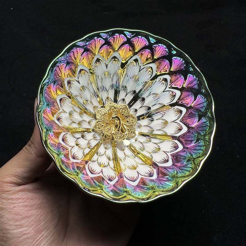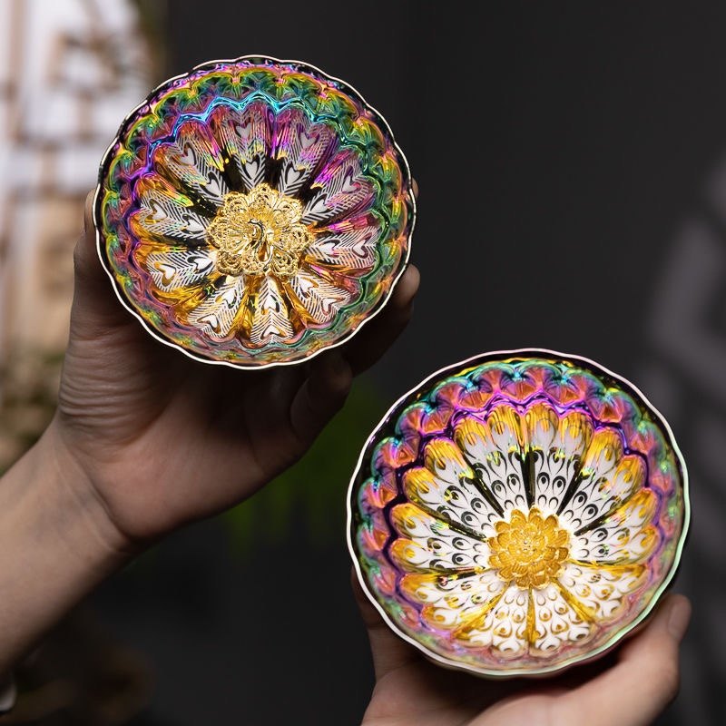 高档七彩孔雀金建盏莲花主人茶杯窑变茶杯茶盏幻彩莲花杯建盏杯子