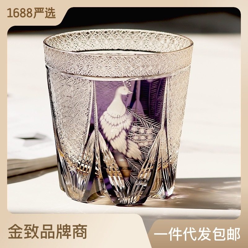 江户切子手工雕刻水晶玻璃杯威士忌杯轻奢高颜值紫孔雀水杯礼品装