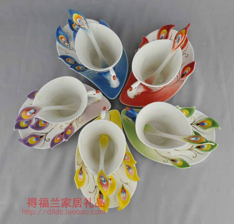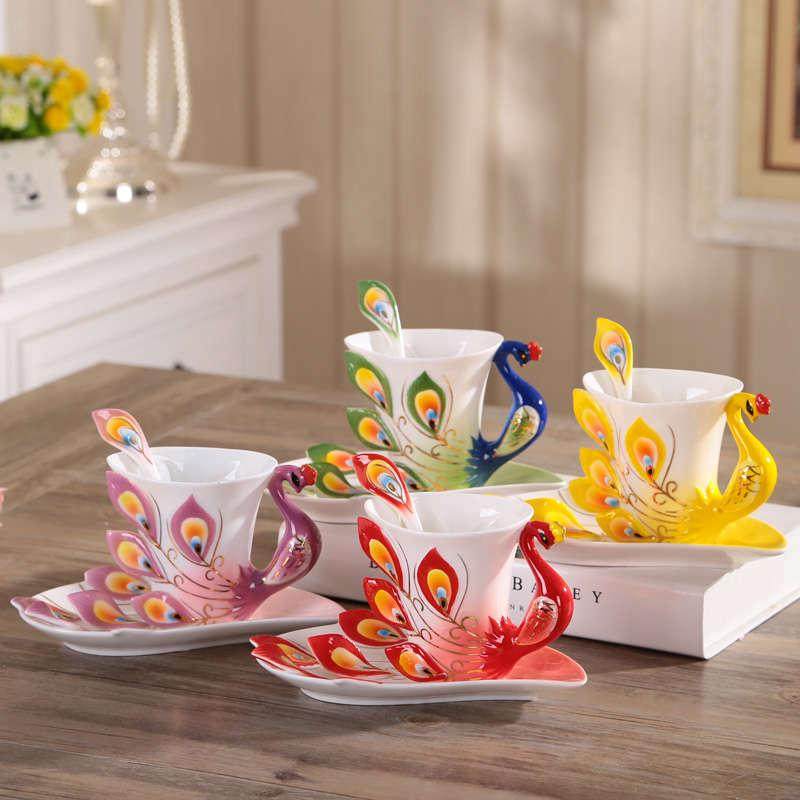 珐琅彩骨陶瓷孔雀杯咖啡杯碟勺情人节对杯子结婚庆生日创意礼物品
