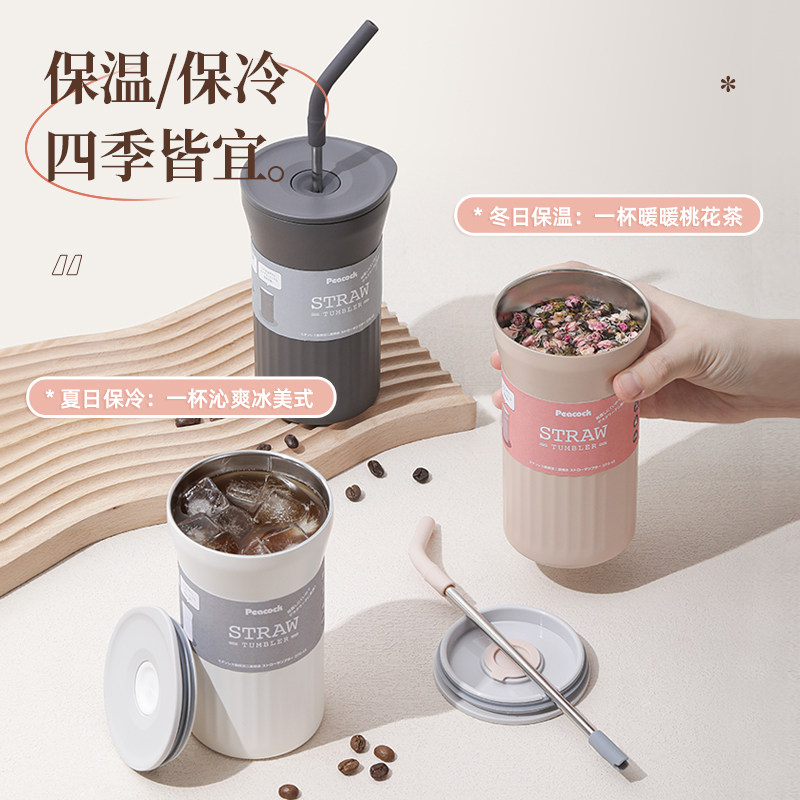 日本孔雀吸管保温杯女男士不锈钢咖啡杯便携随行杯子夏季保冷水杯