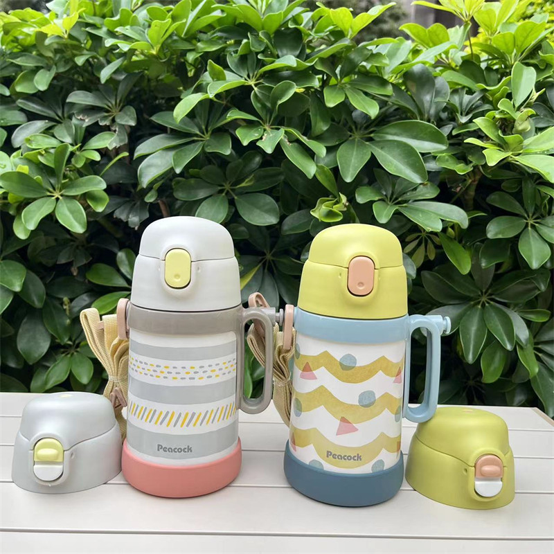 日本孔雀peacock儿童保温杯316不锈钢吸管水杯带把手背带水壶防摔