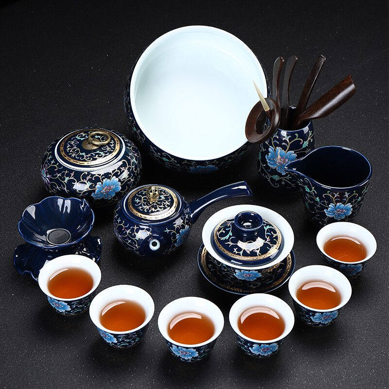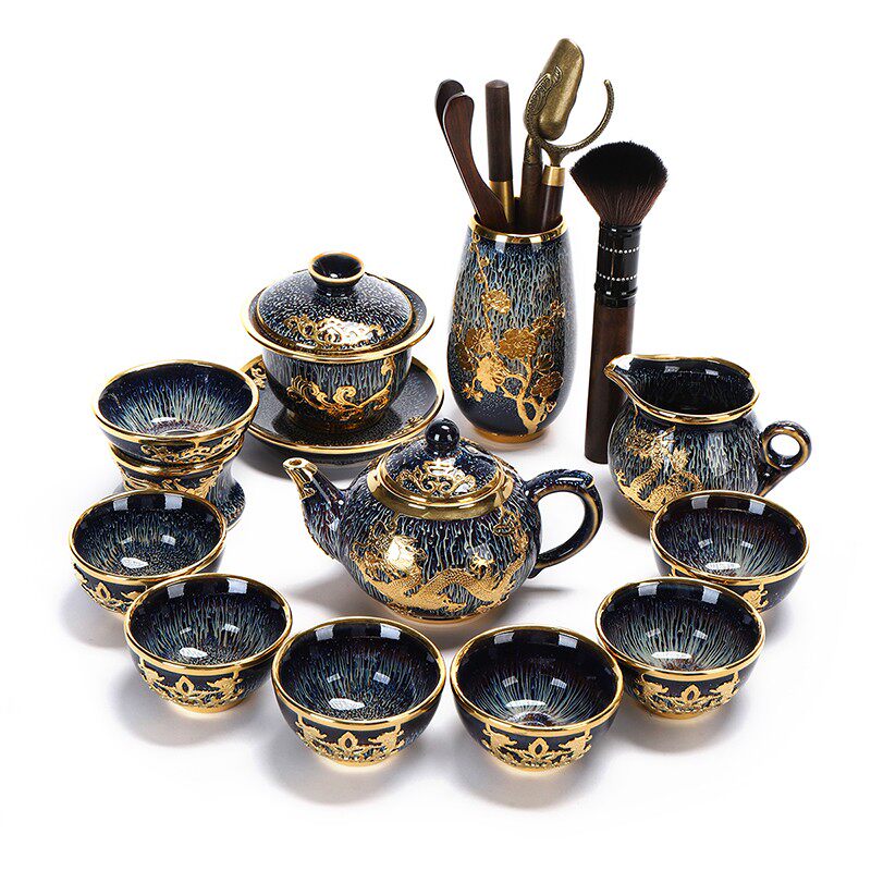 康乐品镶金功夫茶具套装整套窑变黑釉建盏家用喝茶茶杯办公泡茶器