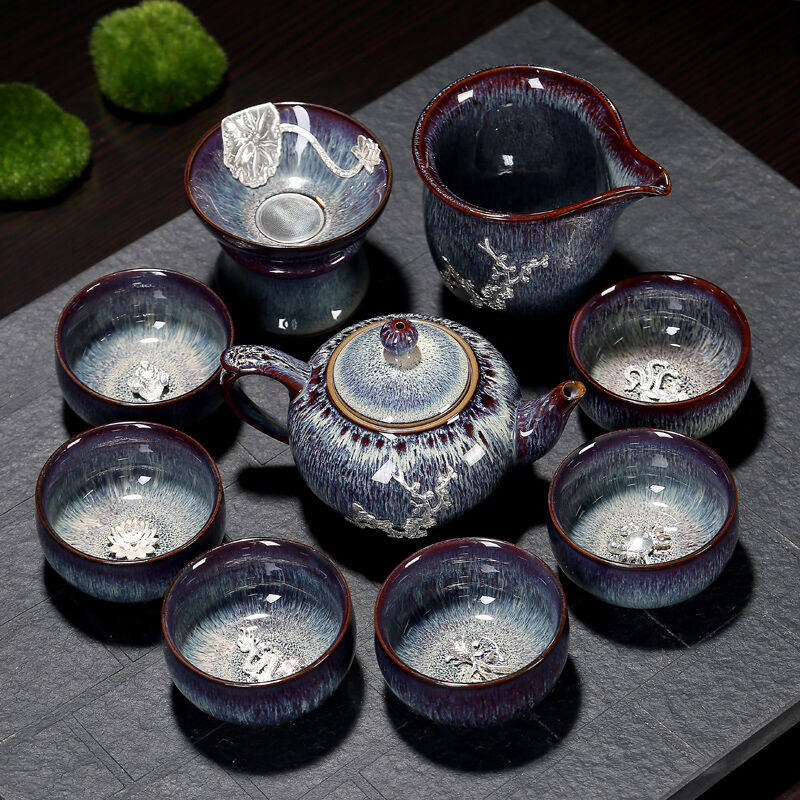 康乐品建盏鎏银茶具套装大号功夫茶具窑变陶瓷银饰茶壶杯子品茗杯
