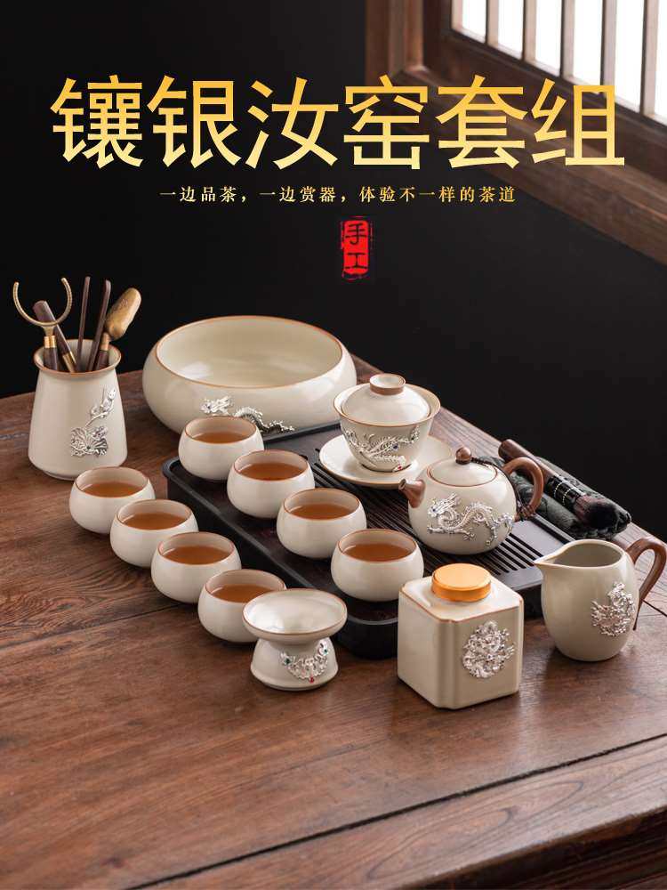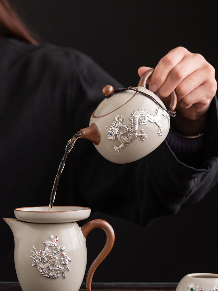 康乐品镶银汝窑茶具套装盖碗茶壶轻奢功夫茶具高档陶瓷茶壶茶杯