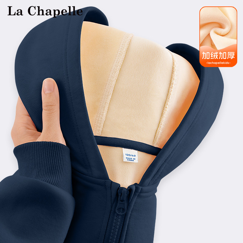 拉夏贝尔男童外套秋冬款儿童2024新款加绒棉袄大童藏蓝色连帽卫衣