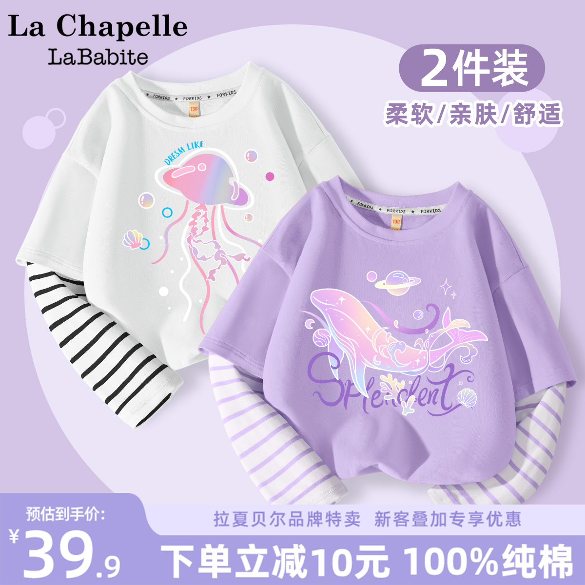 拉夏贝尔女童t恤长袖春季薄款打底衫女宝宝童装纯棉衣服儿童上衣