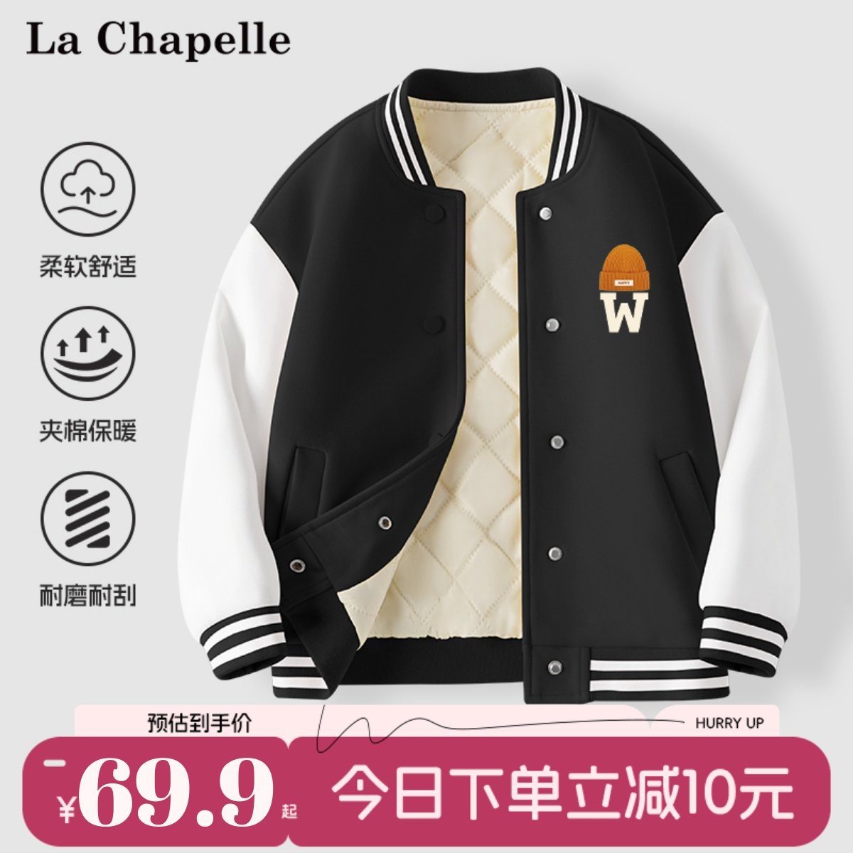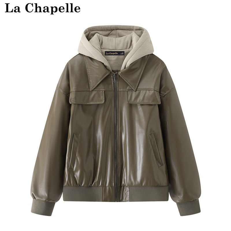 拉夏贝尔/La Chapelle冬季新款复古高街机车风拼接连帽棉服外套女