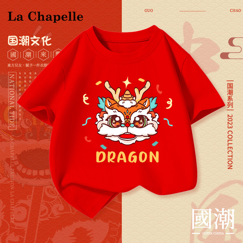 拉夏贝尔女童红色短袖t2024新年儿童纯棉衣服大童龙年本命年半袖