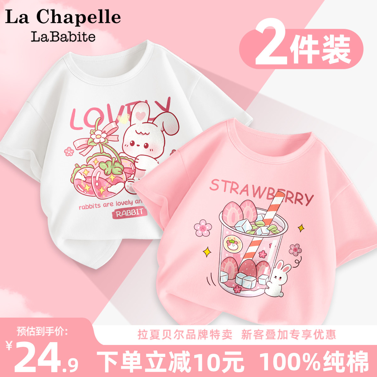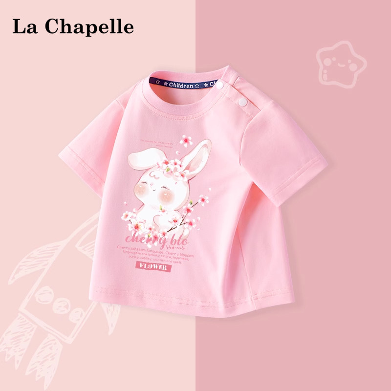 拉夏贝尔儿童打底衫半袖宝宝纯棉衣服婴幼儿可爱兔子t恤女童短袖