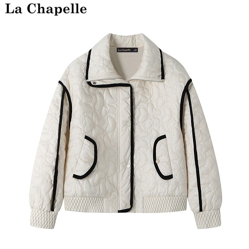 拉夏贝尔/La Chapelle秋冬新款假两件棉衣外套女撞色翻领压花棉服