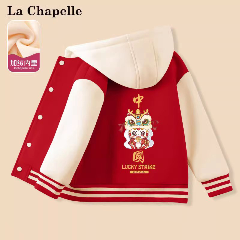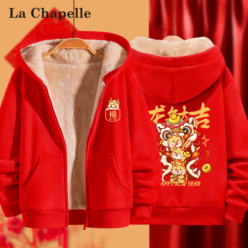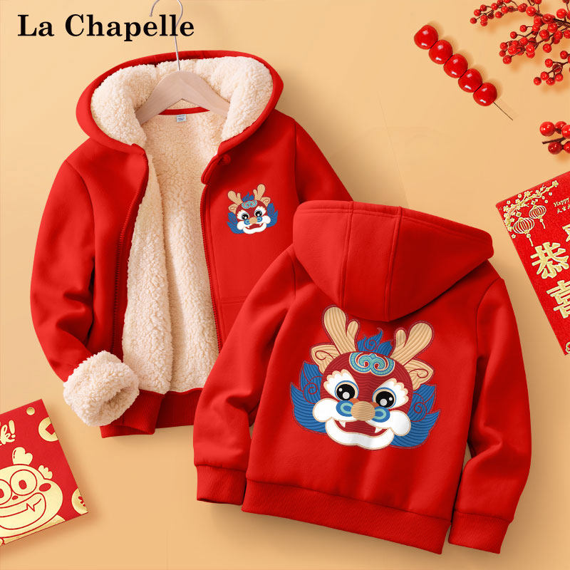 拉夏贝尔男童外套秋冬款2023新款红色龙年羊羔绒棉服儿童喜庆童装