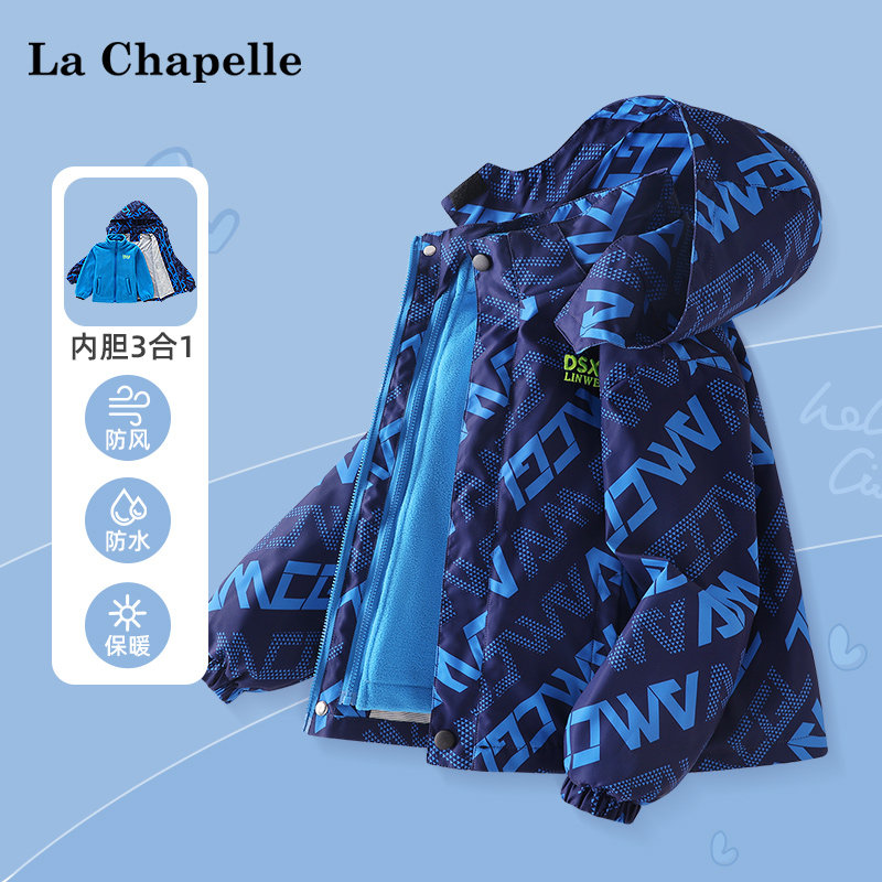 拉夏贝尔儿童冲锋衣三合一秋冬款棉服男童加绒外套男孩防风衣冬装
