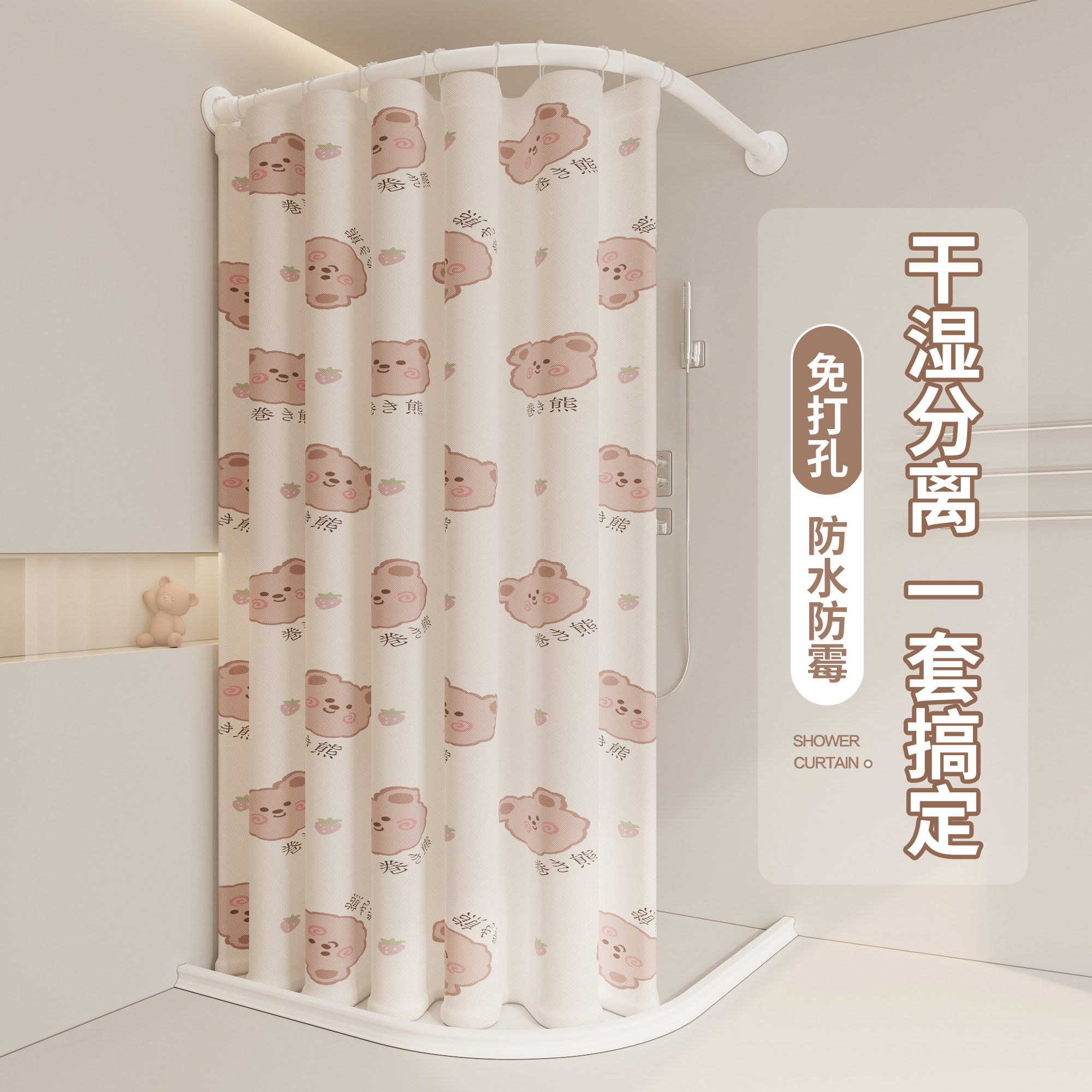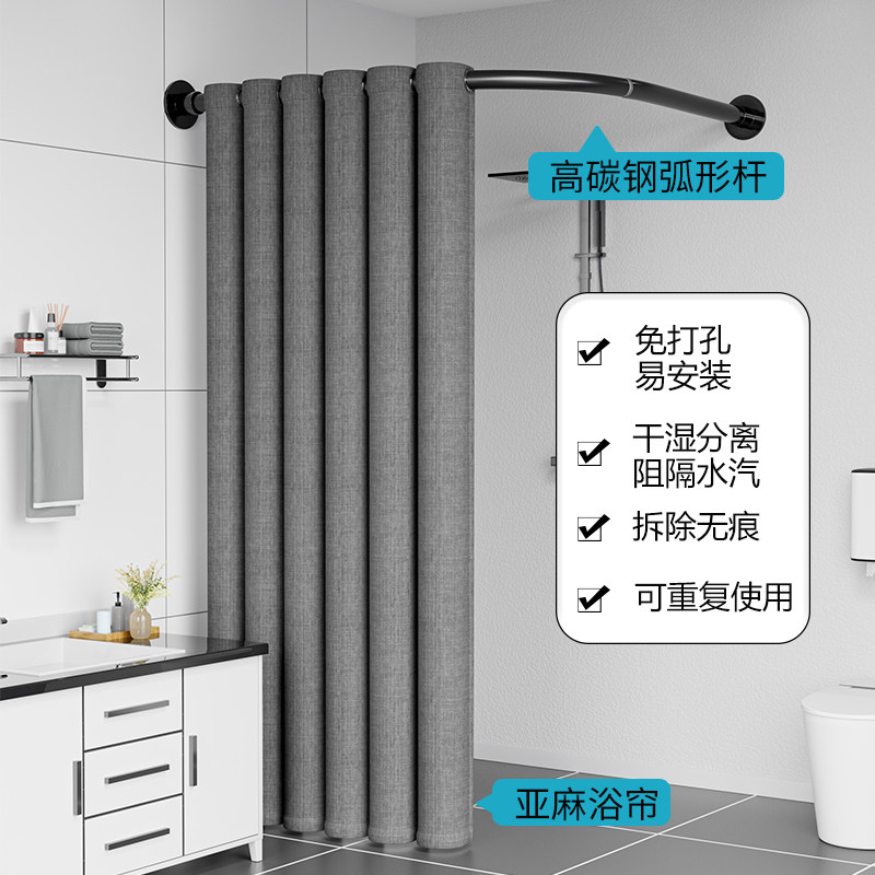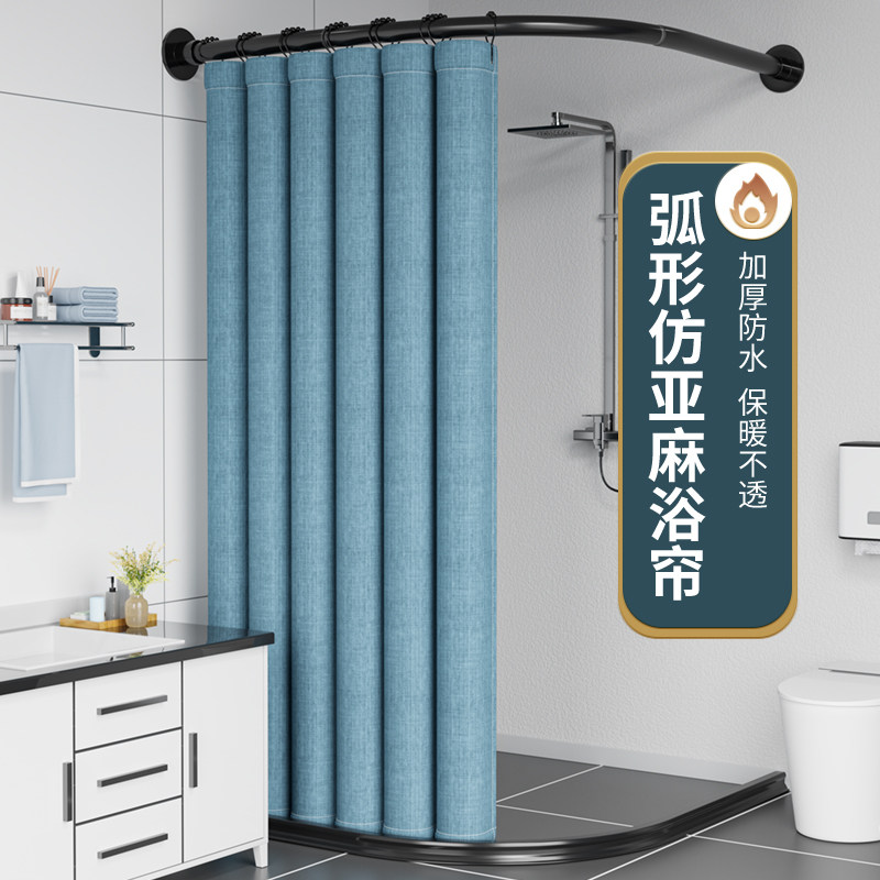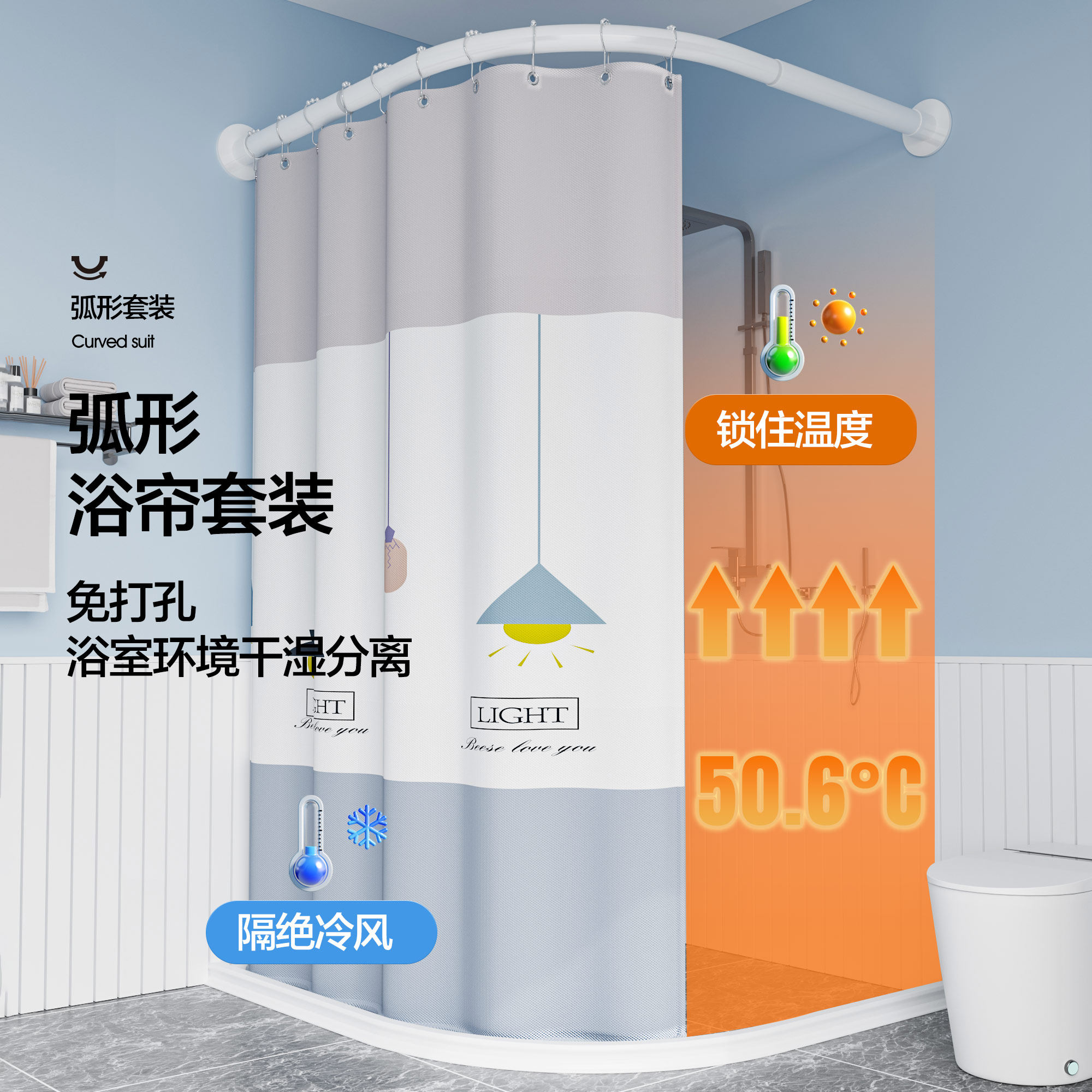 卫生间干湿分离隔断帘子弧形杆子浴帘套装免打孔淋浴房L型防水布