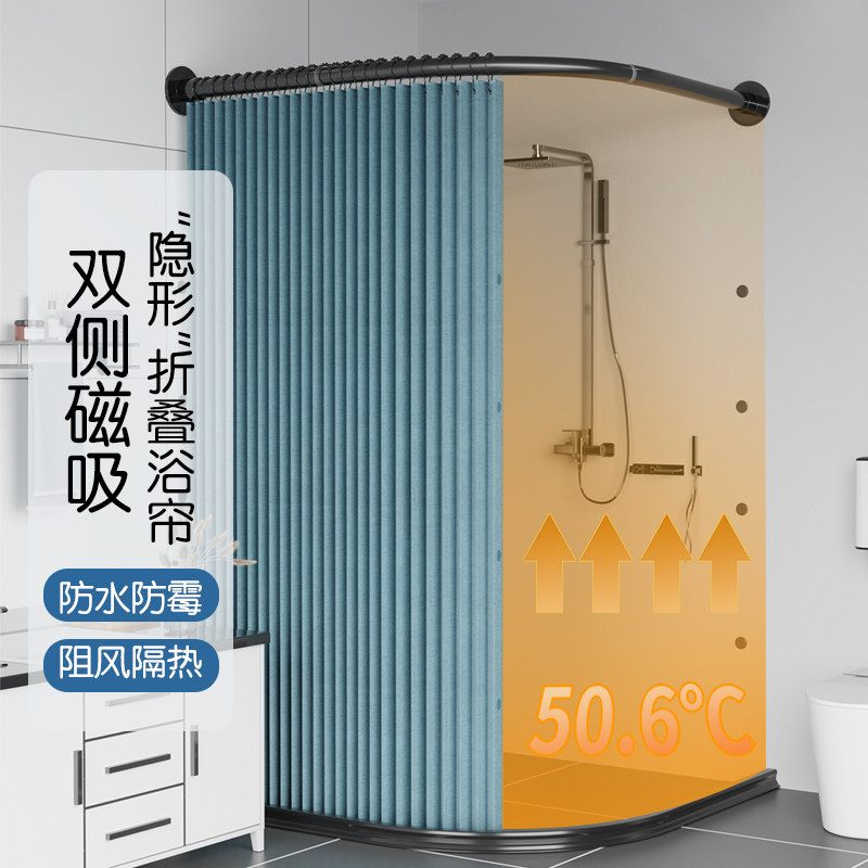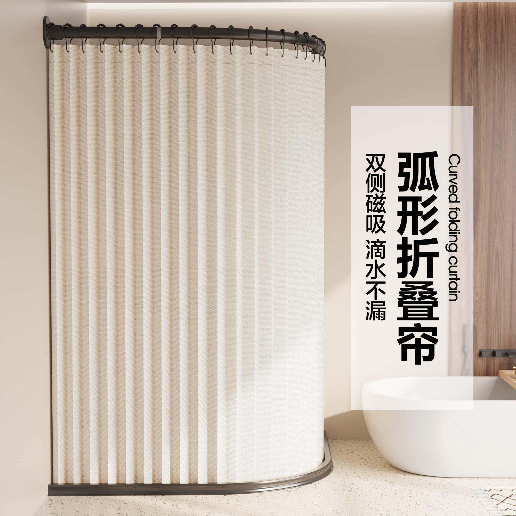 磁吸折叠隐形浴室浴帘防水布套装卫生间免打孔弧形杆隔断帘挡水条