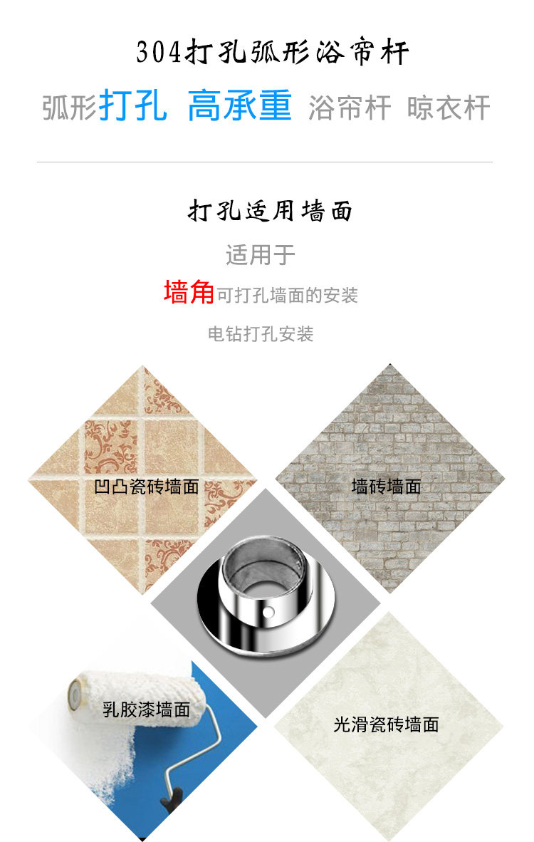 订做浴室套装弧形浴帘杆304不锈钢U形浴帘杆+浴帘+浴帘环+开孔器