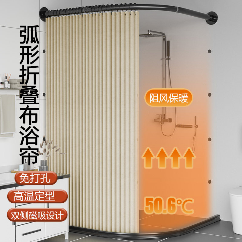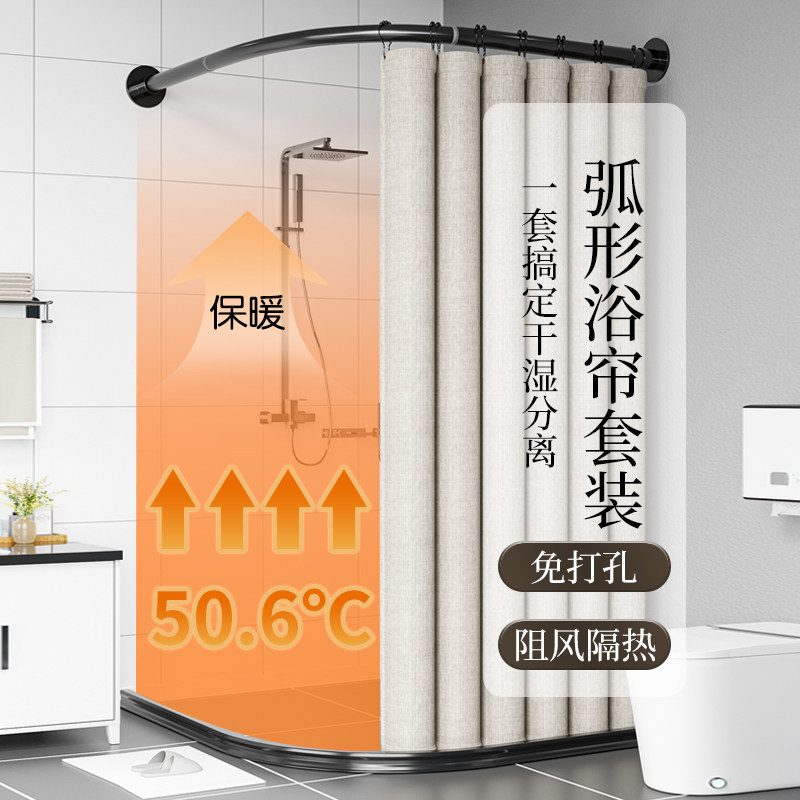卫生间磁性浴帘套装免打孔浴室弧形浴帘杆可伸缩干湿隔断保暖浴罩