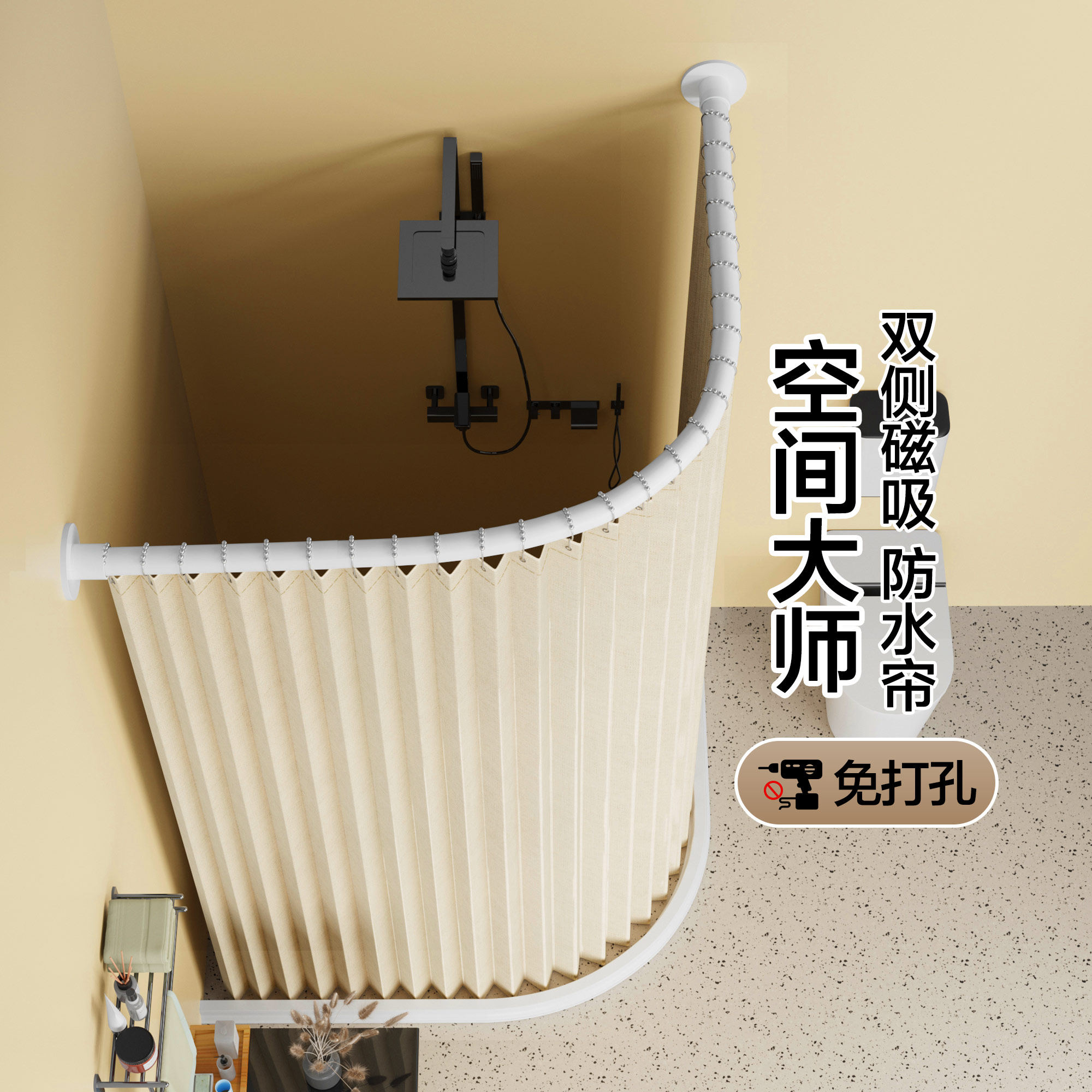 磁吸浴帘套装免打孔浴室卫生间弧形杆折叠防水布干湿分离隔断挂帘