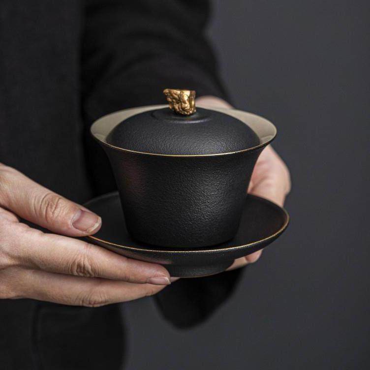 旧望格黑陶描金三才盖碗功夫茶茶具泡茶碗陶瓷茶碗泡茶杯家用