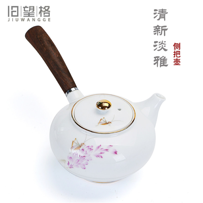 旧望格陶瓷茶具秋韵描金日式侧把壶白瓷木把大号茶壶功夫泡茶器