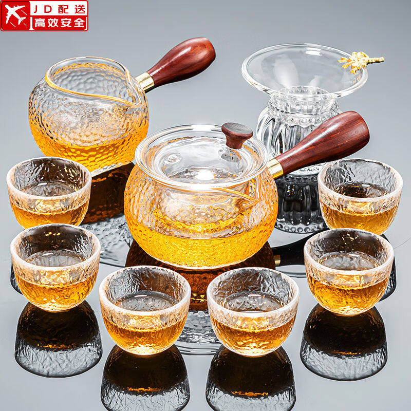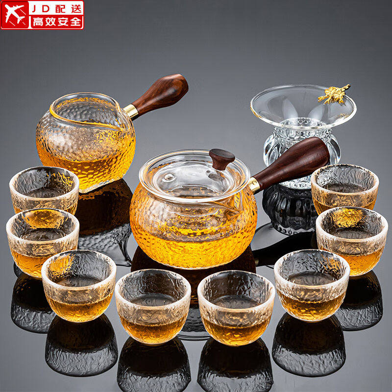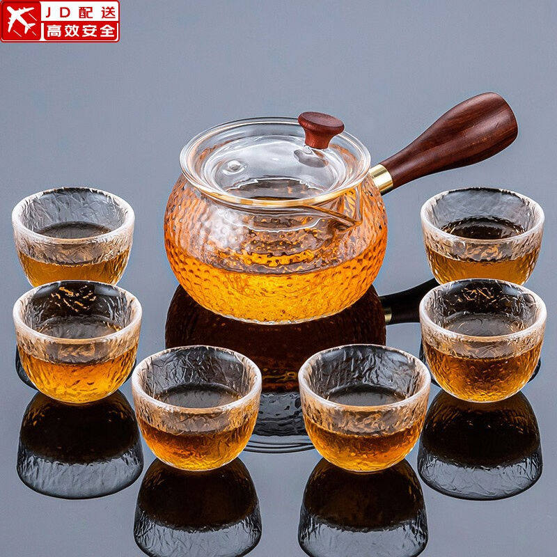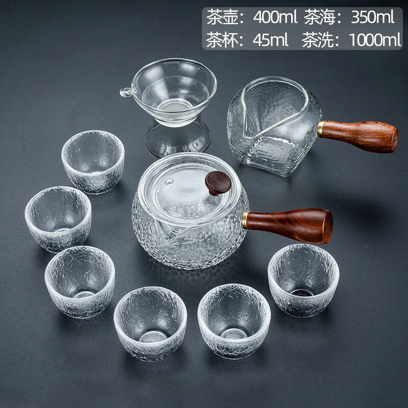 正扬玻璃功夫茶具套装家用锤纹花梨木双侧把泡茶壶耐热茶杯办公整