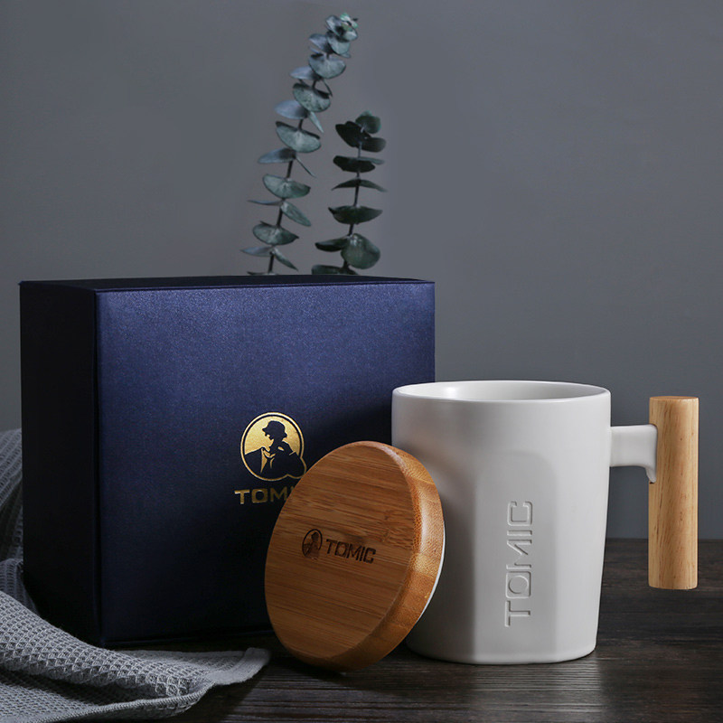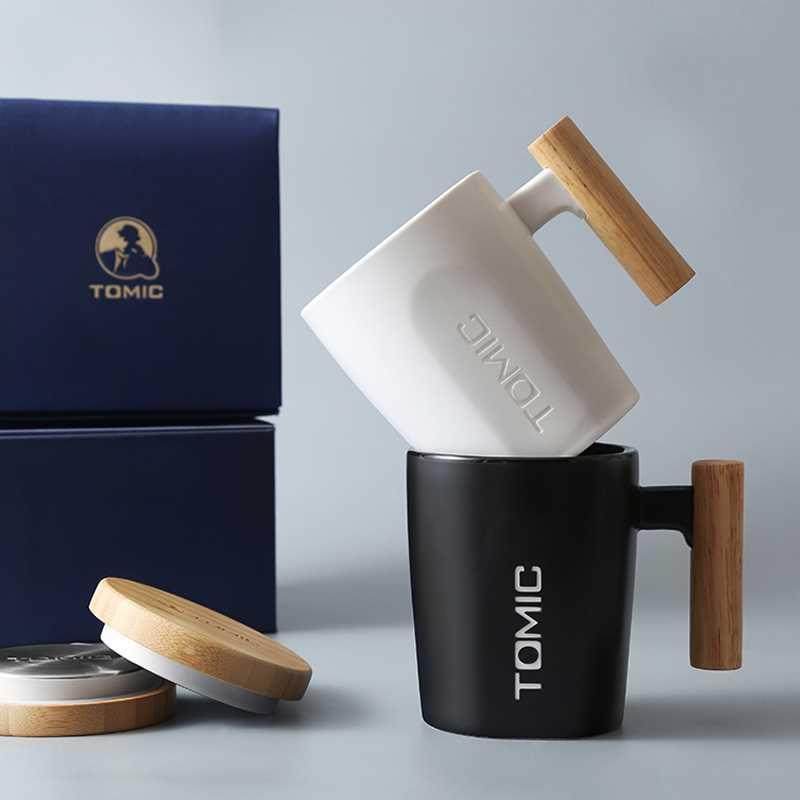 特美刻马克杯木柄陶瓷带盖咖啡喝水燕麦杯情侣家用创意早餐杯送礼